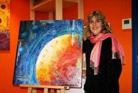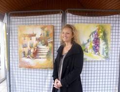 L'artiste pose devant quelques unes de ses toiles exposées aux ateliers du Lézard créatif.