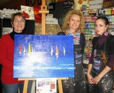 Maud présente son tableau « Venise et voiliers » avec Karine et Tiphanie, les deux animatrices.