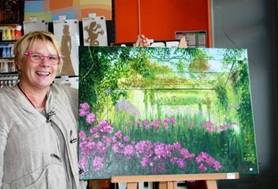 Nathalie Soulet devant une de ses toiles qui représente le jardin de Claude Monet, à Giverny dans l'Eure.
