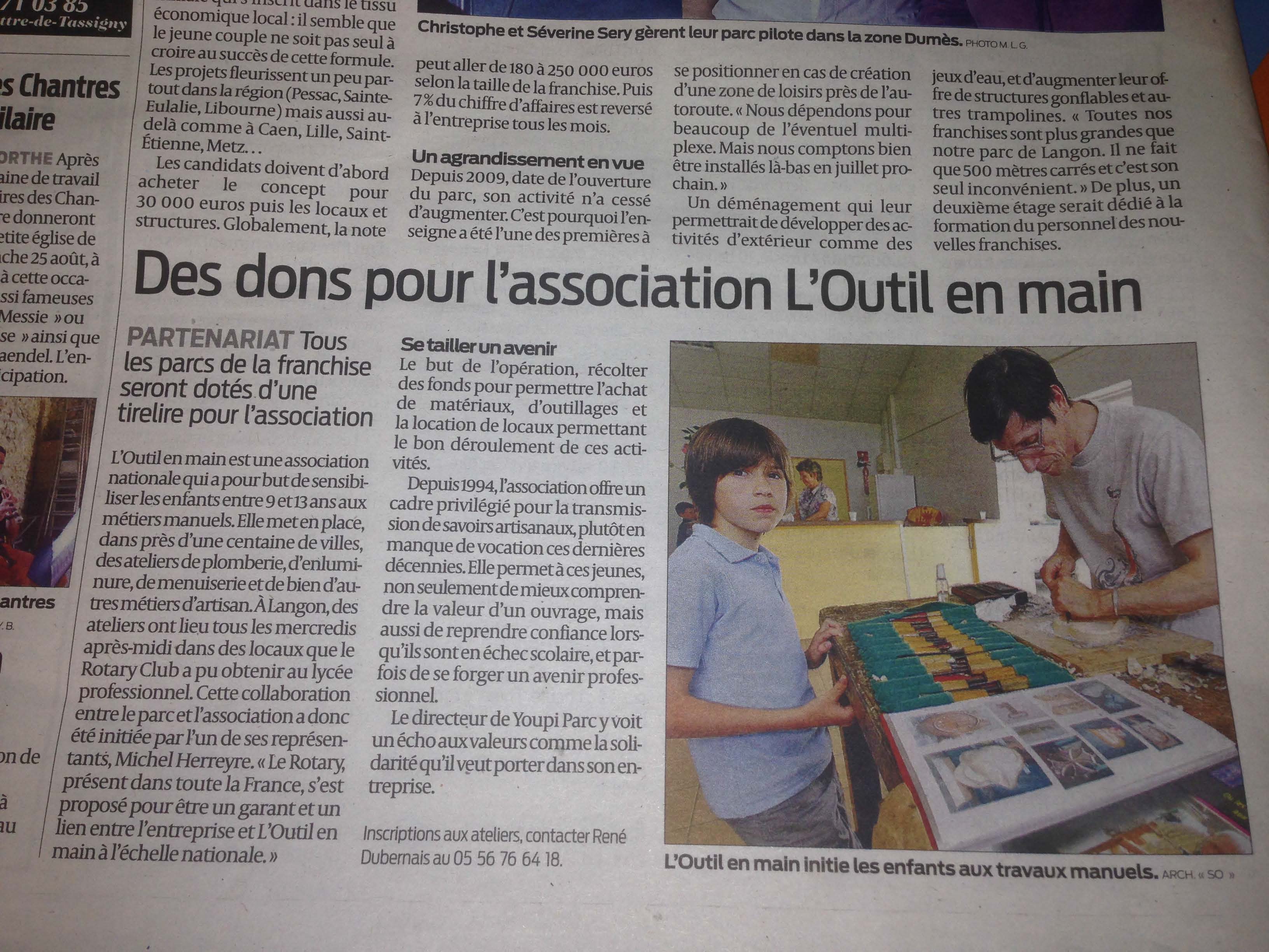 Le réseau de parcs d'attractions d'intérieur Youpi Parc s'engage avec le partenariat du rotary club de Langon pour récolter des dons pour l'association L'Outil en Main.L'Outil en Main offre depuis 1994 de sensibiliser les 9-13 ans aux métiers...