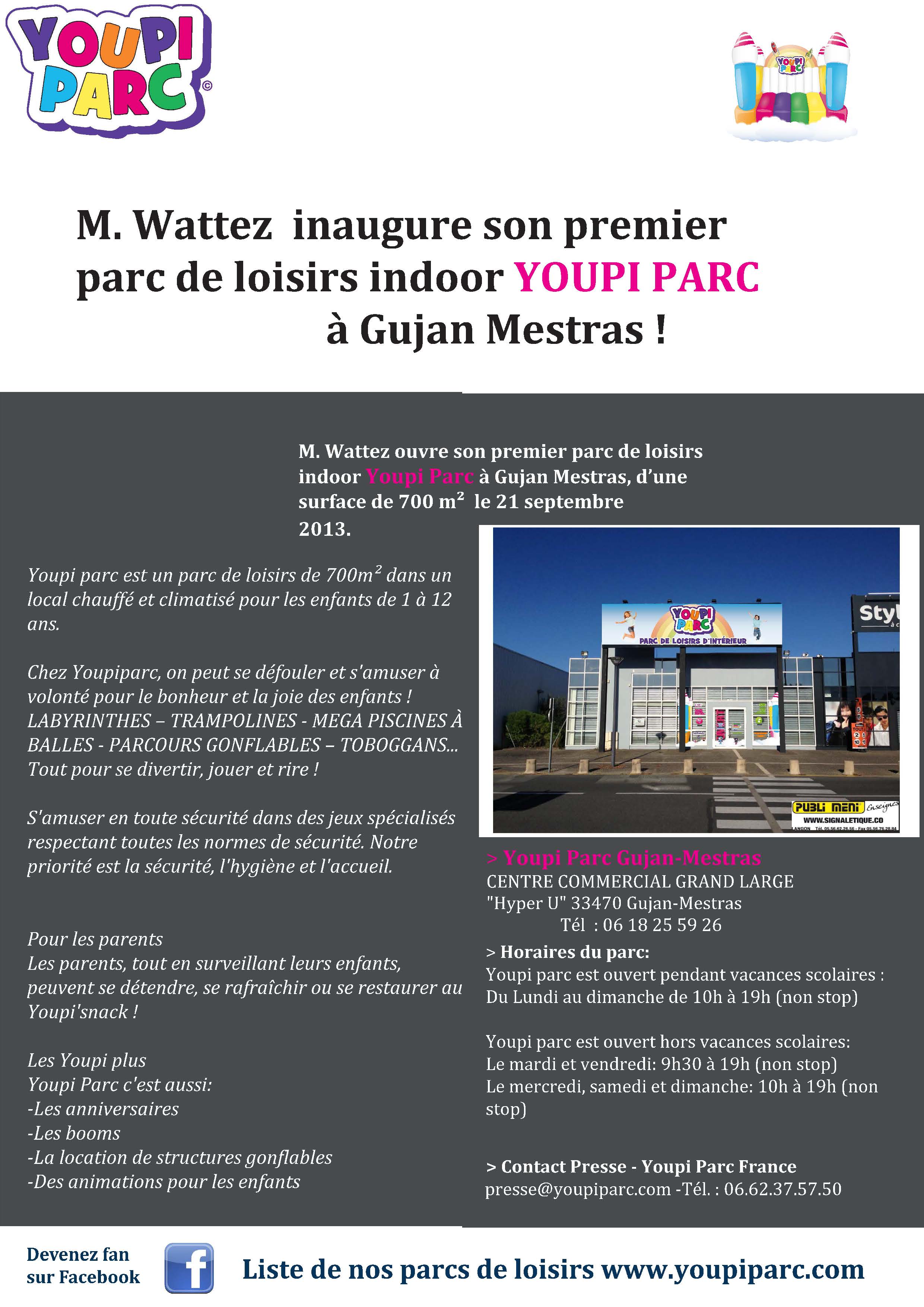 Ouverture de deux nouveaux parc de loisirs indoor Youpi Parc à Libourne et Pessac d'une surface de 900 m² ouverture 20 décembre 2013 pour Pessac et courant janvier 2014 pour Libourne.Youpi parc est un parc de loisirs de 900m² dans un local...
