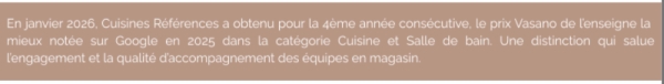 Cuisines Références récompensée du Prix Vasano, pour la 4ème année consécutive Cuisines Références s’impose à nouveau comme l’enseigne la mieux notée sur Google en 2025 dans la catégorie Cuisine et Salle de bain, avec une note...