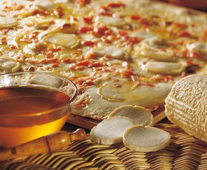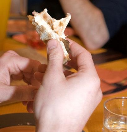 Elle est servie pour 4 personnes au centre de la table, découpée avec une roulette spéciale et mangée avec les doigts.